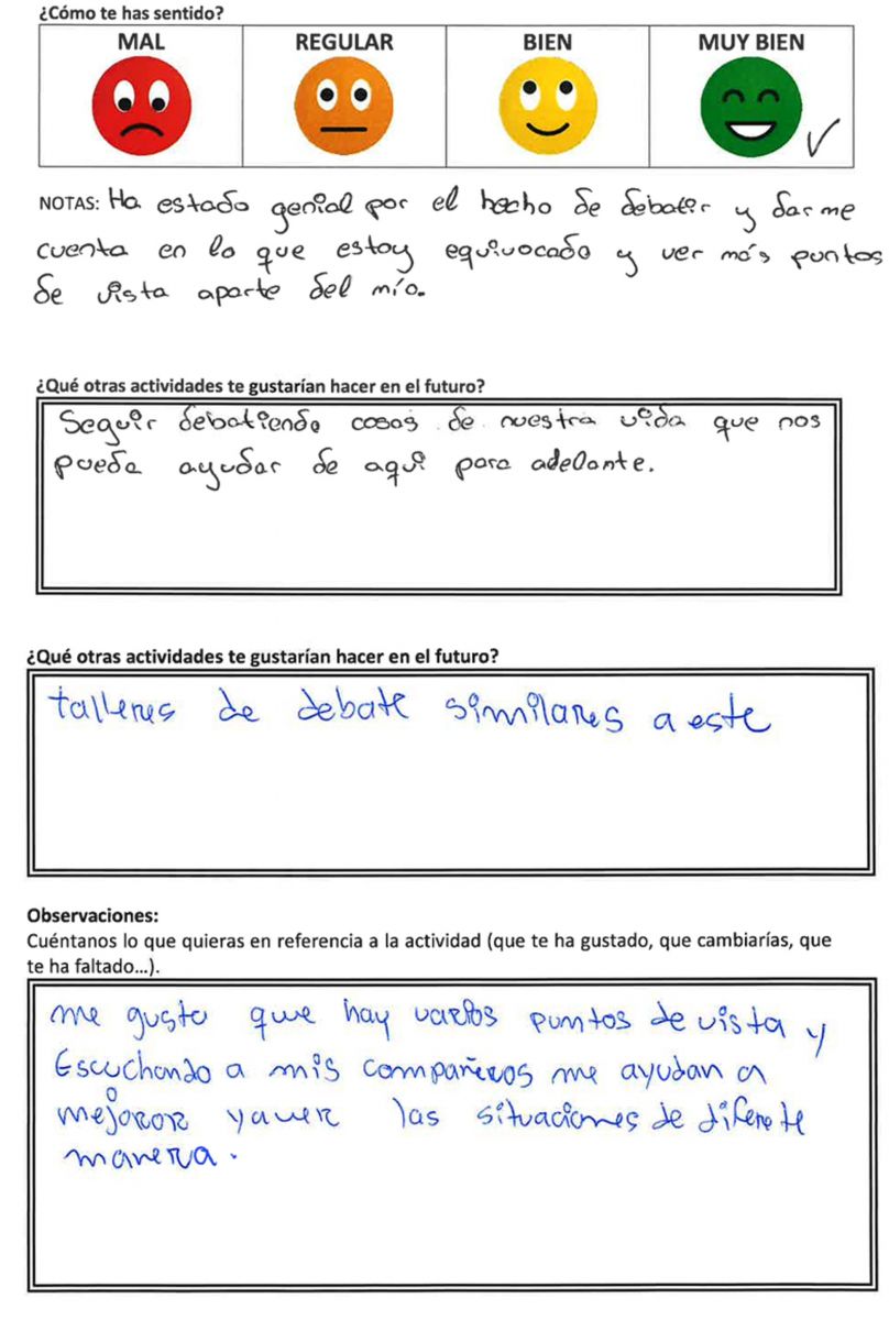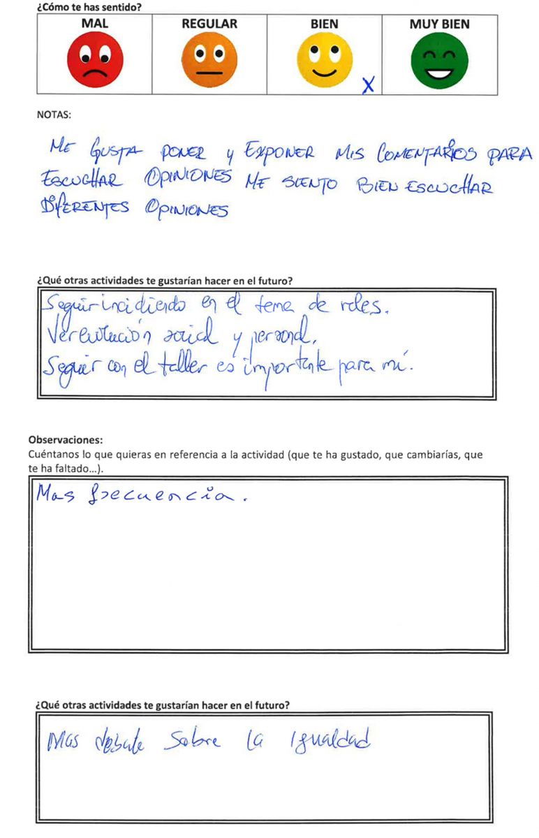 En las evaluaciones finales anónimas, los participantes han destacado lo transformador que ha sido este espacio para cuestionar normas impuestas, reconociendo el valor de contar con un entorno seguro para hablar sobre sus emociones, vivencias y aspiraciones. Os compartimos algunas de los comentarios que han escrito en las evaluaciones: