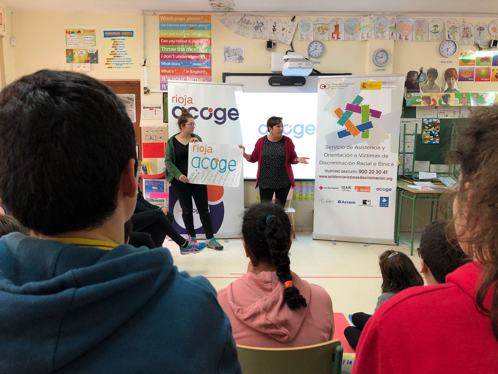 Durante las mañanas de ayer y de hoy, hemos estado realizando la actividad “Conociendo Rioja Acoge” enmarcada dentro del Proyecto “Bretón Solidario” del C.E.I.P Bretón de los Herreros de Logroño. Realizamos dos sesiones informativas con el objetivo de sensibilizar a alumnos de 5º y 6º de primaria, sobre la promoción de la convivencia intercultural, la igualdad de trato y la no discriminación, a través del conocimiento del trabajo que realizamos desde nuestra asociación. Realizamos así, un breve recorrido por todas nuestras áreas de trabajo y proyectos: Atención Socio-Jurídica, Clases de Lengua, Cárcel, Sensibilización, Proyecto ICI, Refugio, Voluntariado, No Discriminación e Inmigracionalismo.